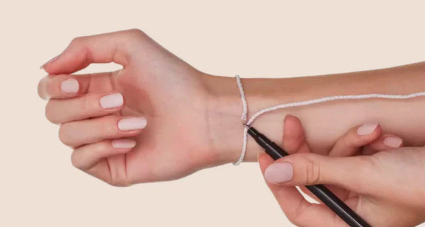 Con il palmo della mano aperto e rivolto verso l'alto, avvolgi lo spago o la striscia di carta intorno al polso appena sopra l'osso del polso segna con una penna o con un pennarello il punto di incontro delle estremità. Successivamente, stendi il cordoncino o il pezzo di carta e misuralo fino al punto in cui avrai fatto il segno per trovare la misura del tuo polso e annotarla.