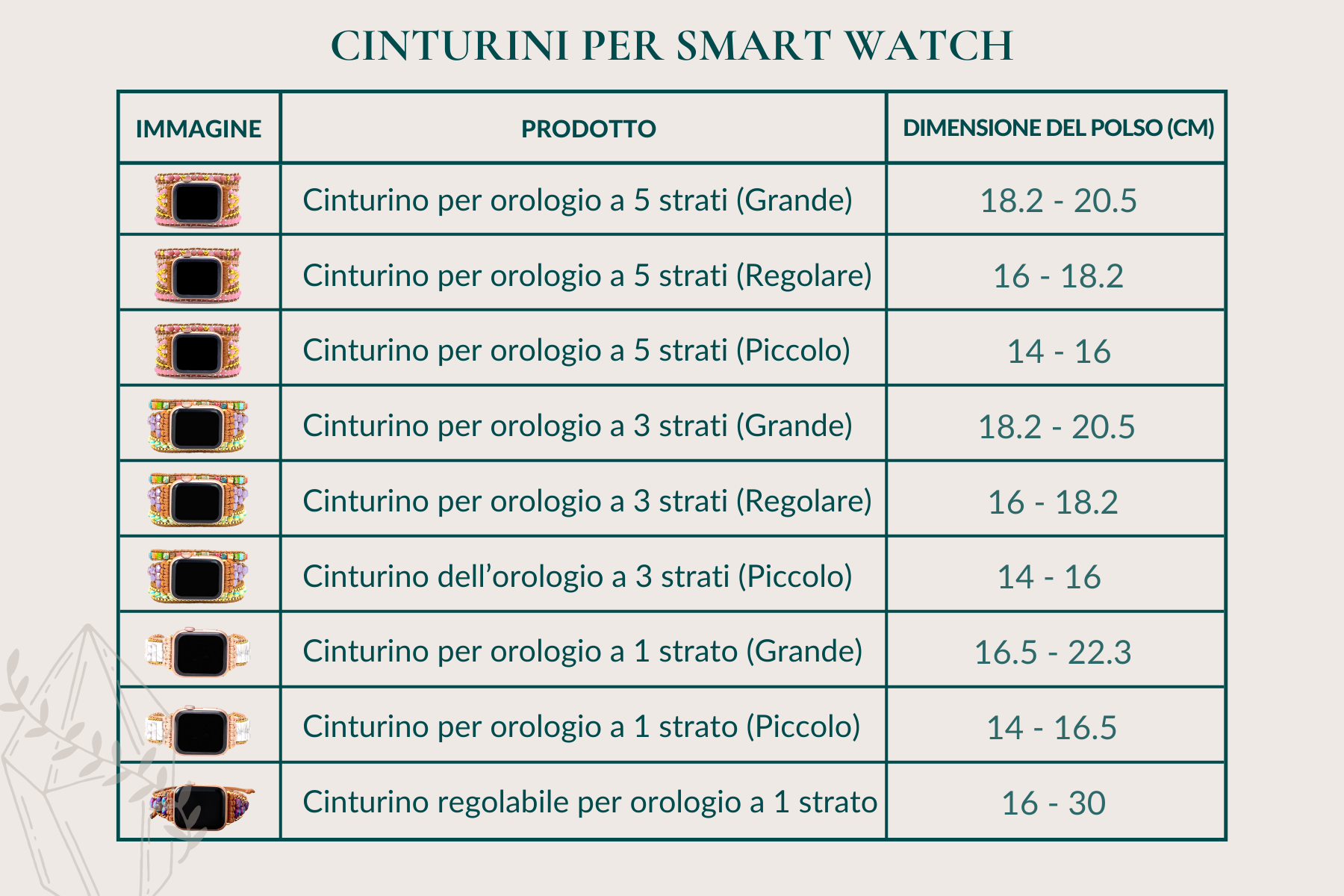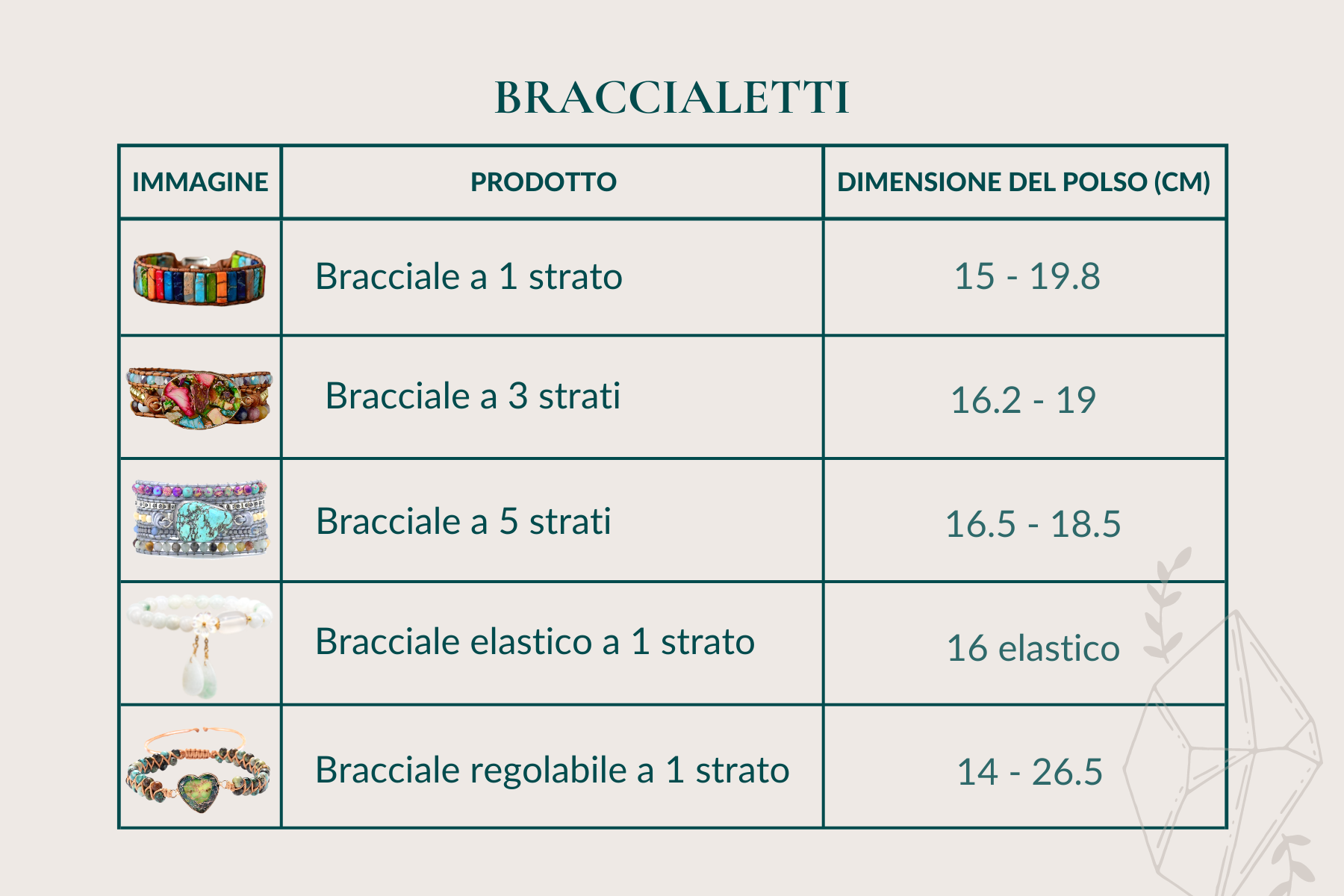 Confronta la misura del polso appena trovata con la tabella del tipo di bracciale che preferisci per vedere quale misura di bracciale corrisponde al tuo polso.